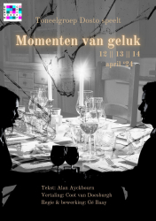 In een ‘echte Ayckbourn’ wordt het ogenschijnlijk harmonieuze bestaan doorgelicht en komen we er achter dat veel ‘schone schijn’ is. In ‘Momenten van geluk’ komt een gelukkig gezin, echtpaar met twee zonen en hun vrouwen, bij elkaar in een restaurant om er de verjaardag van de moeder te vieren. We maken niet alleen kennis met het heden, maar de schrijver verplaatst de handeling op een vernuftige en hilarische manier naar verleden en toekomst. Zo wordt de werkelijkheid tegelijk navrant en hilarisch neergezet. In ‘Momenten van geluk’ is Ayckbourn weer op z’n best: vernuftig, geraffineerd en uiterst hilarisch.