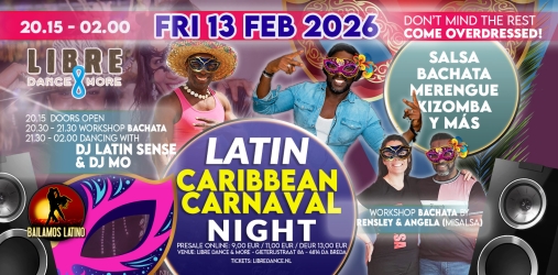 13 FEB 2026 LATIN CARIBBEAN CARNAVAL NIGHT BREDA @ Libre dance and more! We starten met een Workshop Bachata door Rensley en Angela van MiSalsa