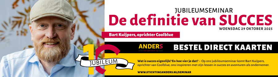 Wat is succes eigenlijk? En hoe vier je dat? Op woensdag 29 oktober komt Bart Kuijpers, oprichter van Coolblue, ons inspireren met zijn verhaal en zijn avontuur als ondernemer. Ter gelegenheid van het 10-jarig bestaan van Stichting ANDERS komt hij ons alles vertellen over zijn visie én lessen in succes. Een inspirerende avond die je echt niet wilt missen.
