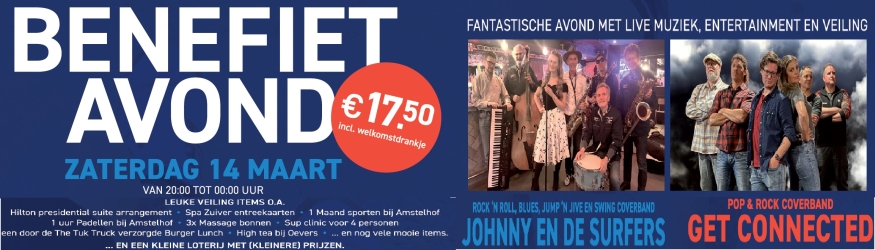 Helaas hebben we moeten besluiten om de benefietavond van 14 maart 2026 niet door te laten gaan. De belangstelling was niet voldoende. Kopers zullen hun geld terugontvangen via Ticketkantoor.